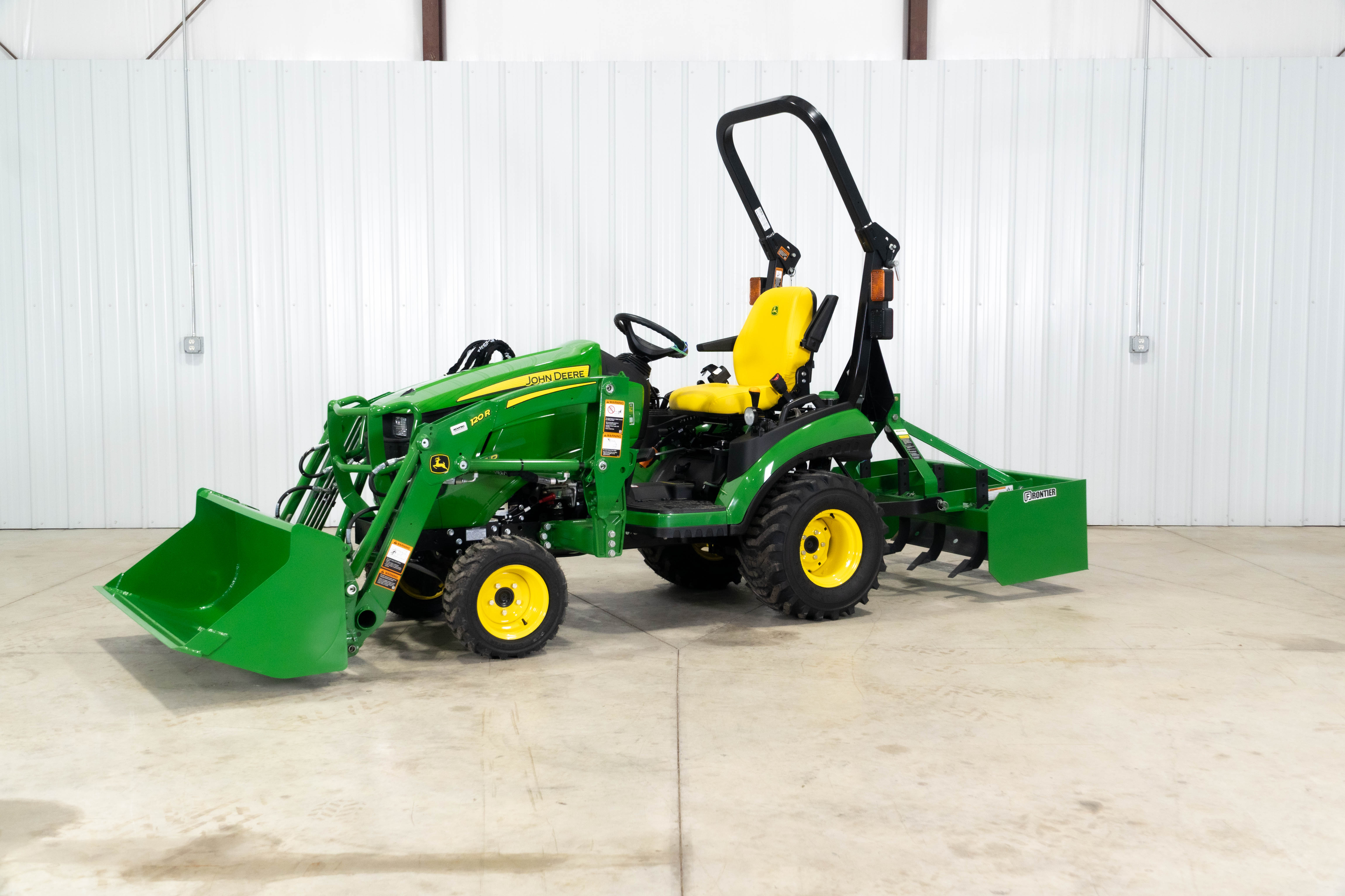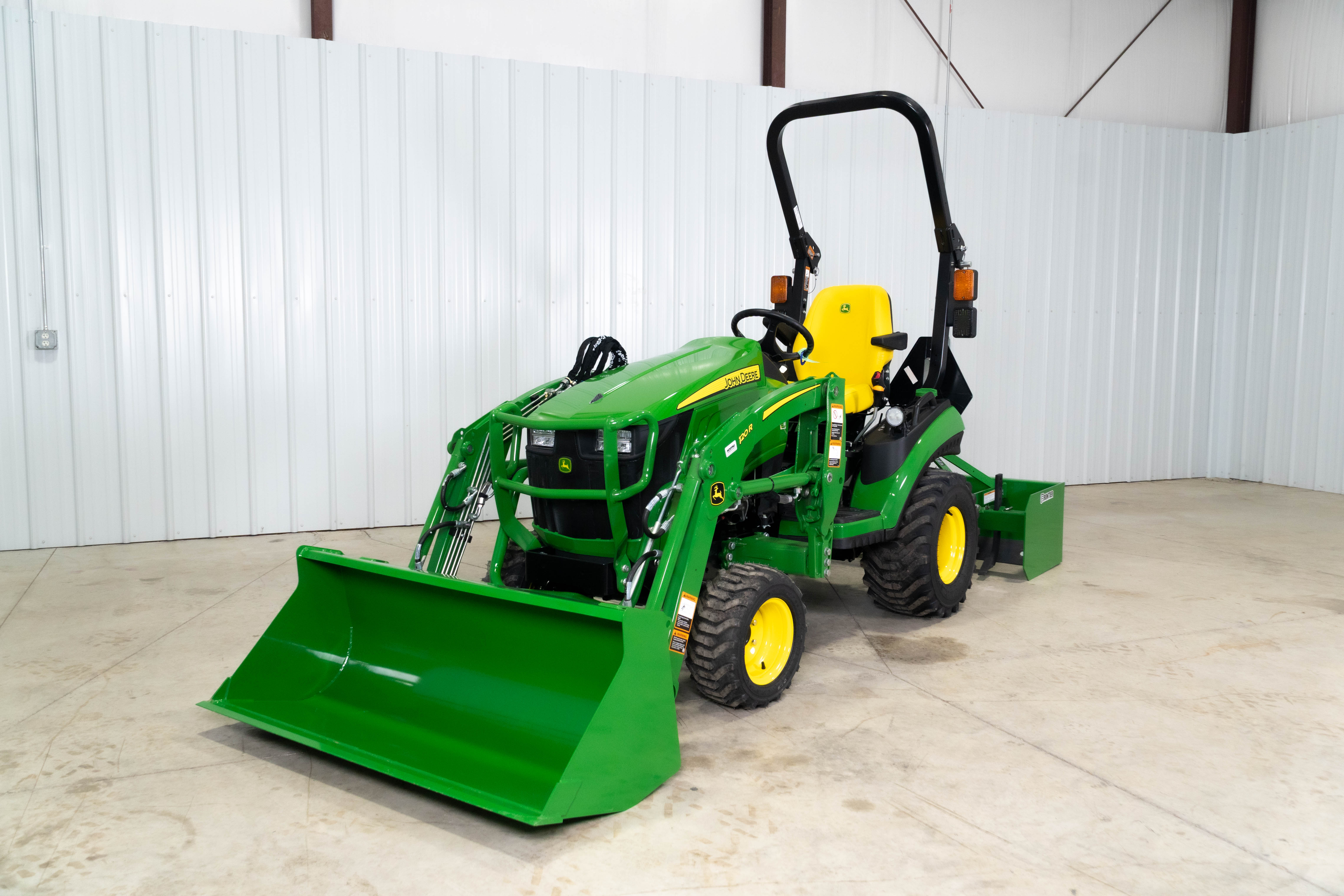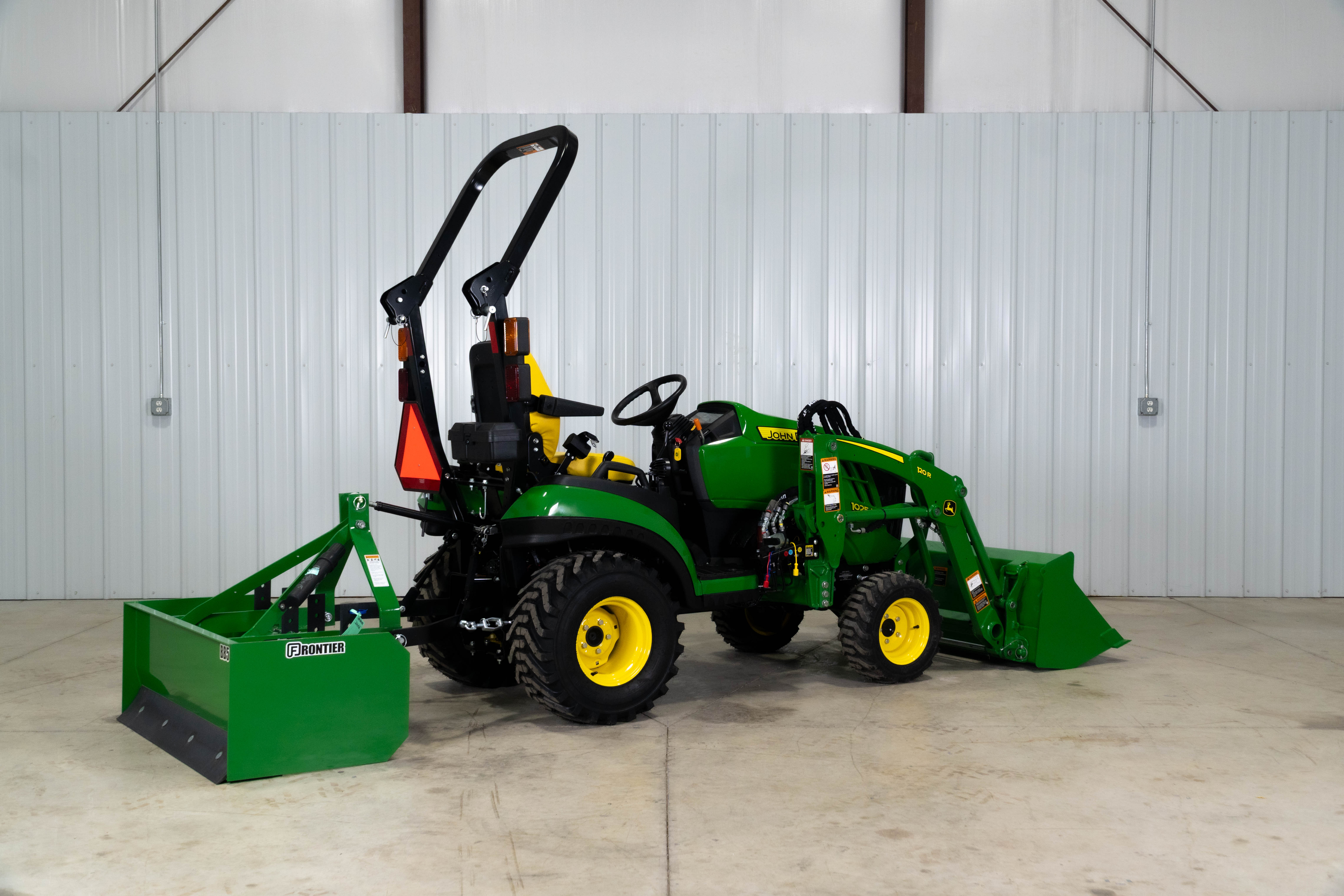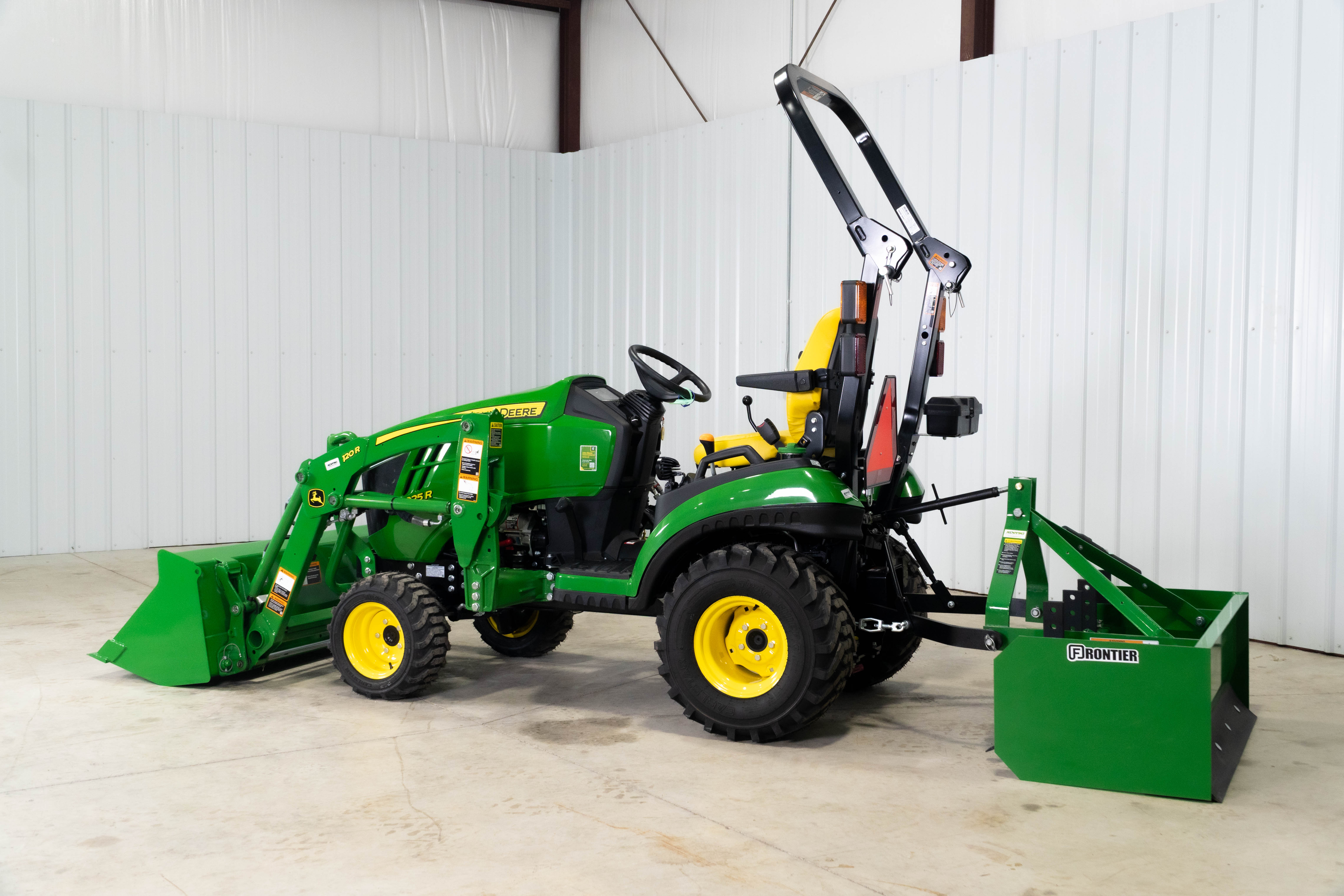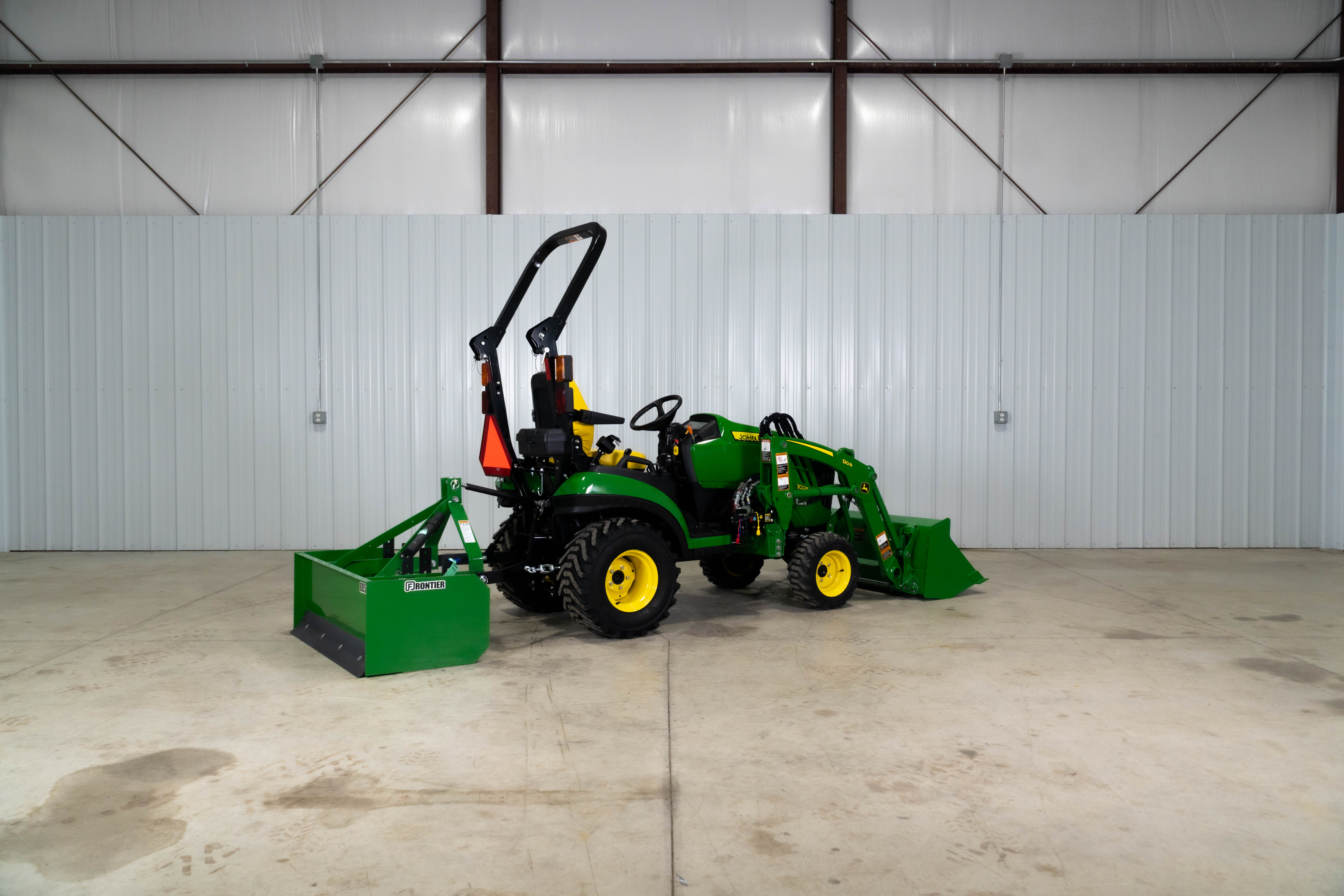 The 1025R Warrior pairs the agile John Deere 1025R with a 120R loader and BB5048L box blade so property owners can grade driveways, level gravel, and handle light site prep without moving up to a larger frame tractor.​​