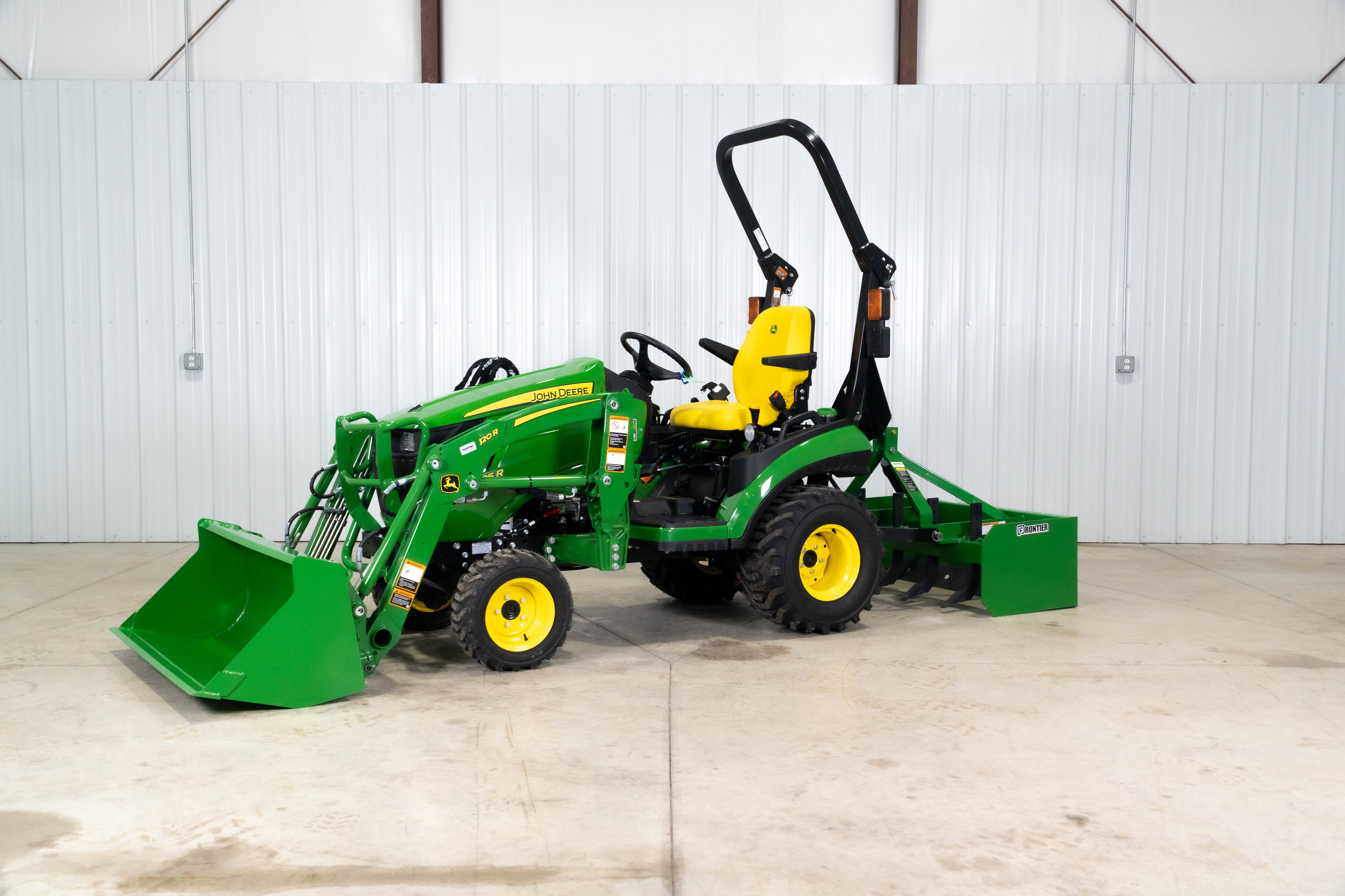 Step up to a 2025R with 120R loader and RT3049 tiller for deeper soil prep, garden and food‑plot work, and heavier loader tasks on larger acreages.
