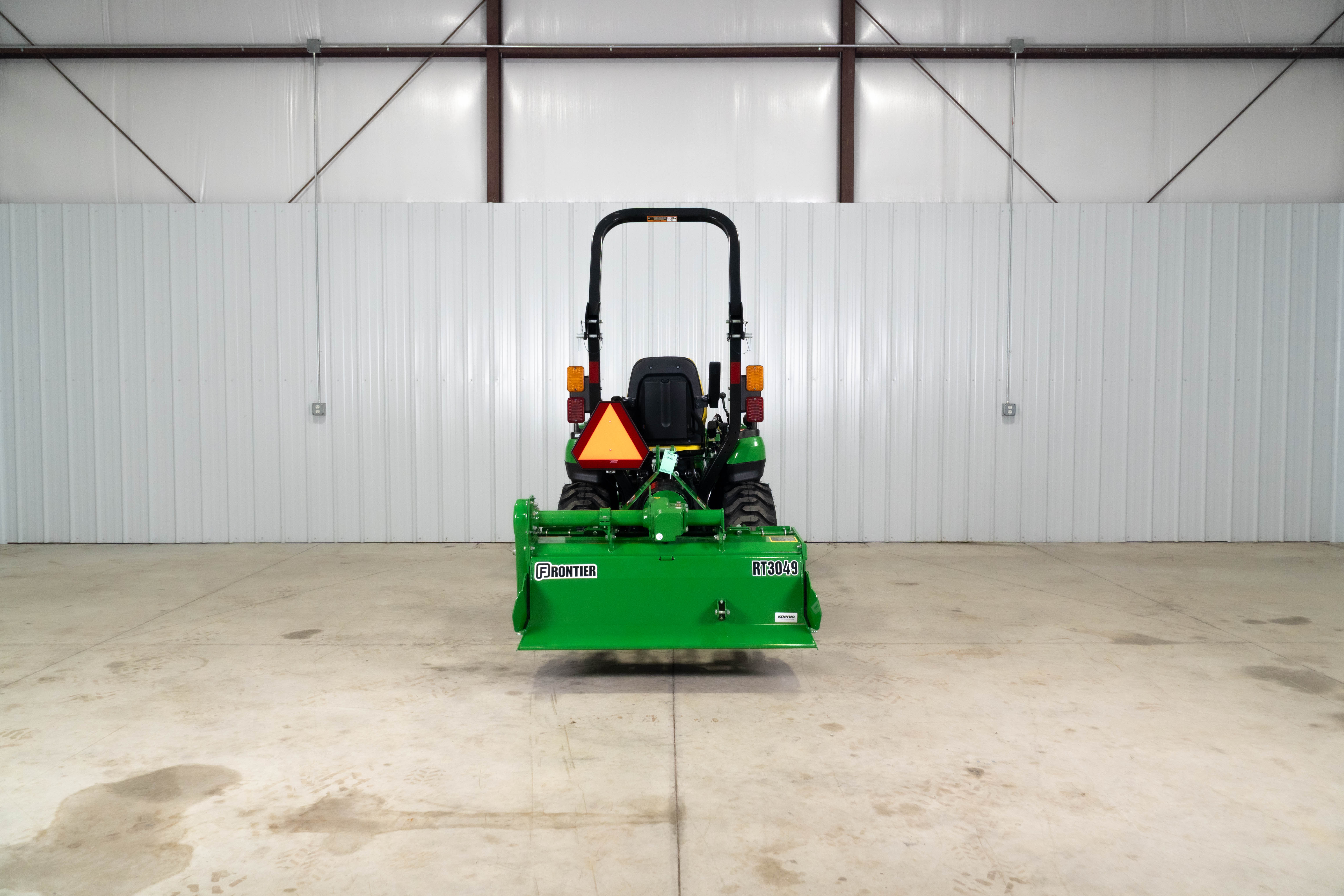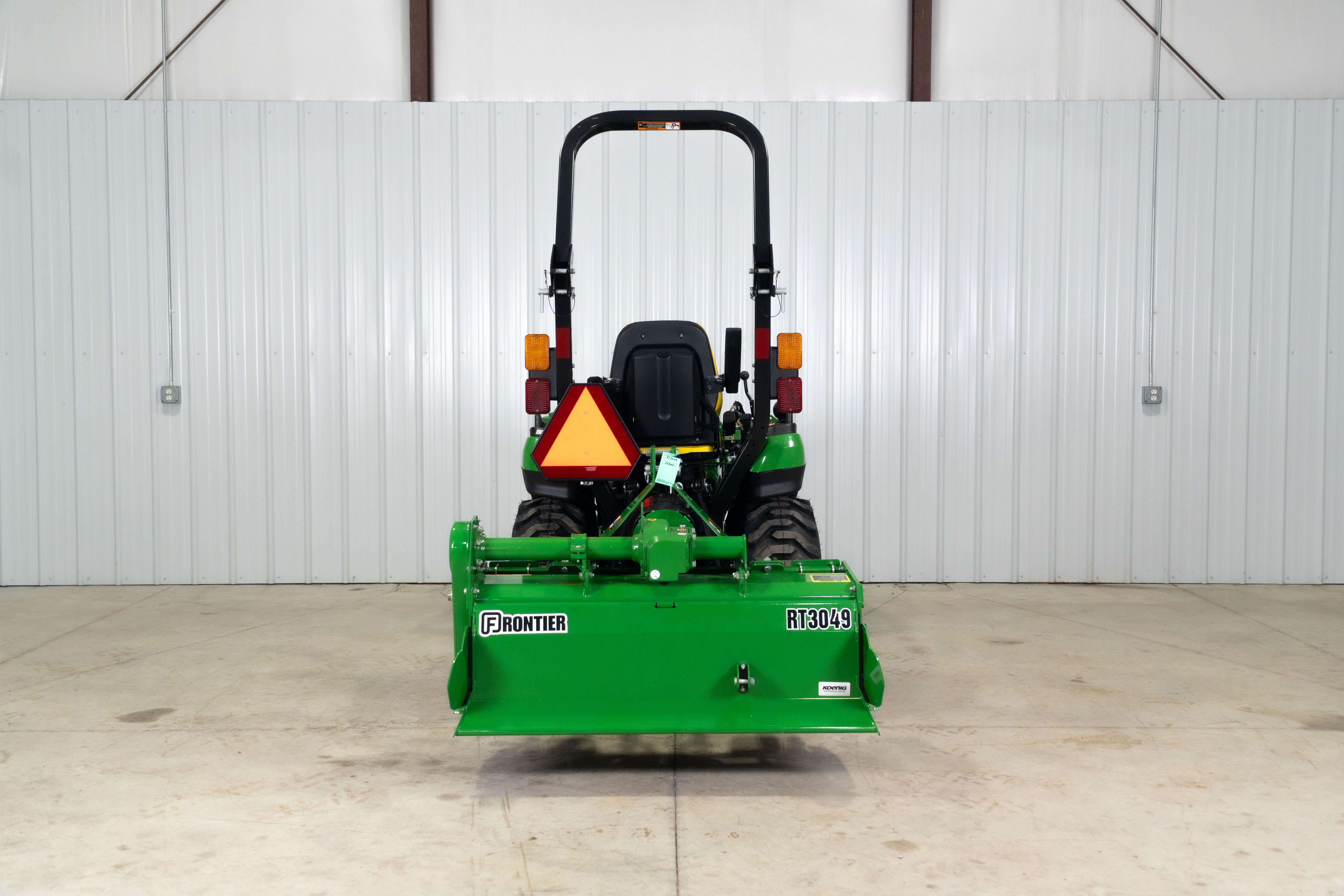The 2025R Hero upgrades you to a 2 Series platform with more horsepower, a heavier frame, and a 120R loader, paired with an RT3049 tiller that works up to about 7.5 inches deep to create seedbeds in tough soils.